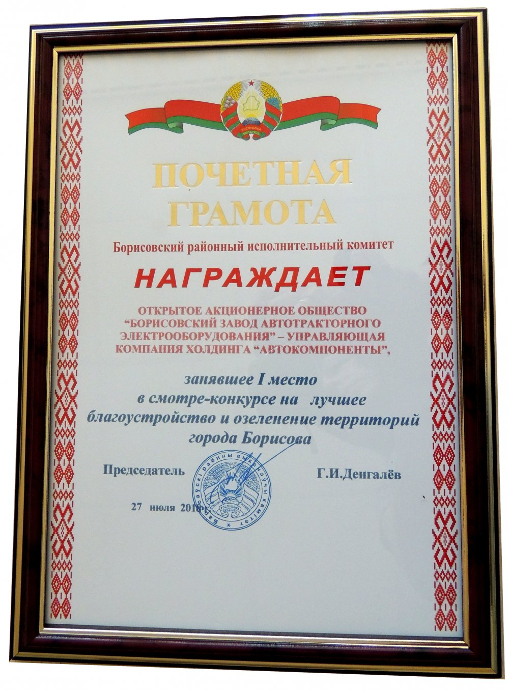 Всего в этом году в смотре-конкурсе приняли более 40 борисовских предприятий и организаций. Победители были объявлены на заседании райисполкома в конце июля. Первое место присуждено ОАО «БАТЭ» – управляющей компании холдинга «Автокомпоненты».