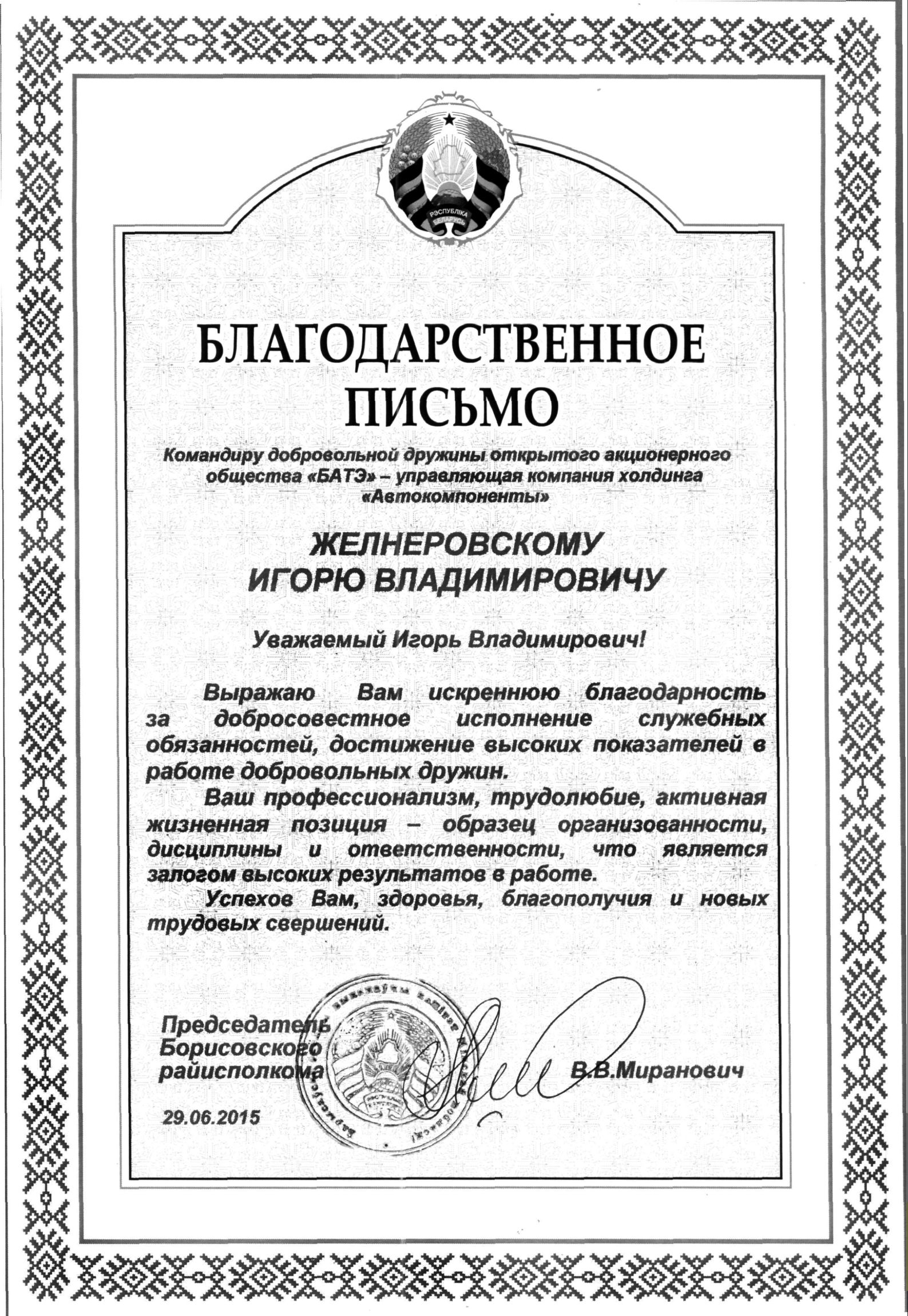 За высокие показатели в работе добровольной дружины, добросовестное исполнение служебных обязанностей Благодарственным письмом председателя Борисовского районного исполнительного комитета награжден Командир добровольной дружины нашего предприятия, заместитель начальника охраны Игорь Владимирович Желнеровский.